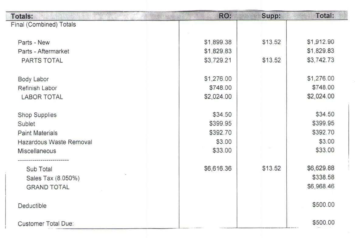 Most of the damage occurred to the wheel well/fender. There was some minor damage to the bumper and my sidestep. However, based on the pictures it doesn’t look horrible right? I didn’t think so. I thought for a $1,500 to $2,000 it could all be fixed. Boy was I wrong. I just got my truck back and the bill for the repair work today. Would you believe it was $6,968.46 to repair? Attached is my receipt.
